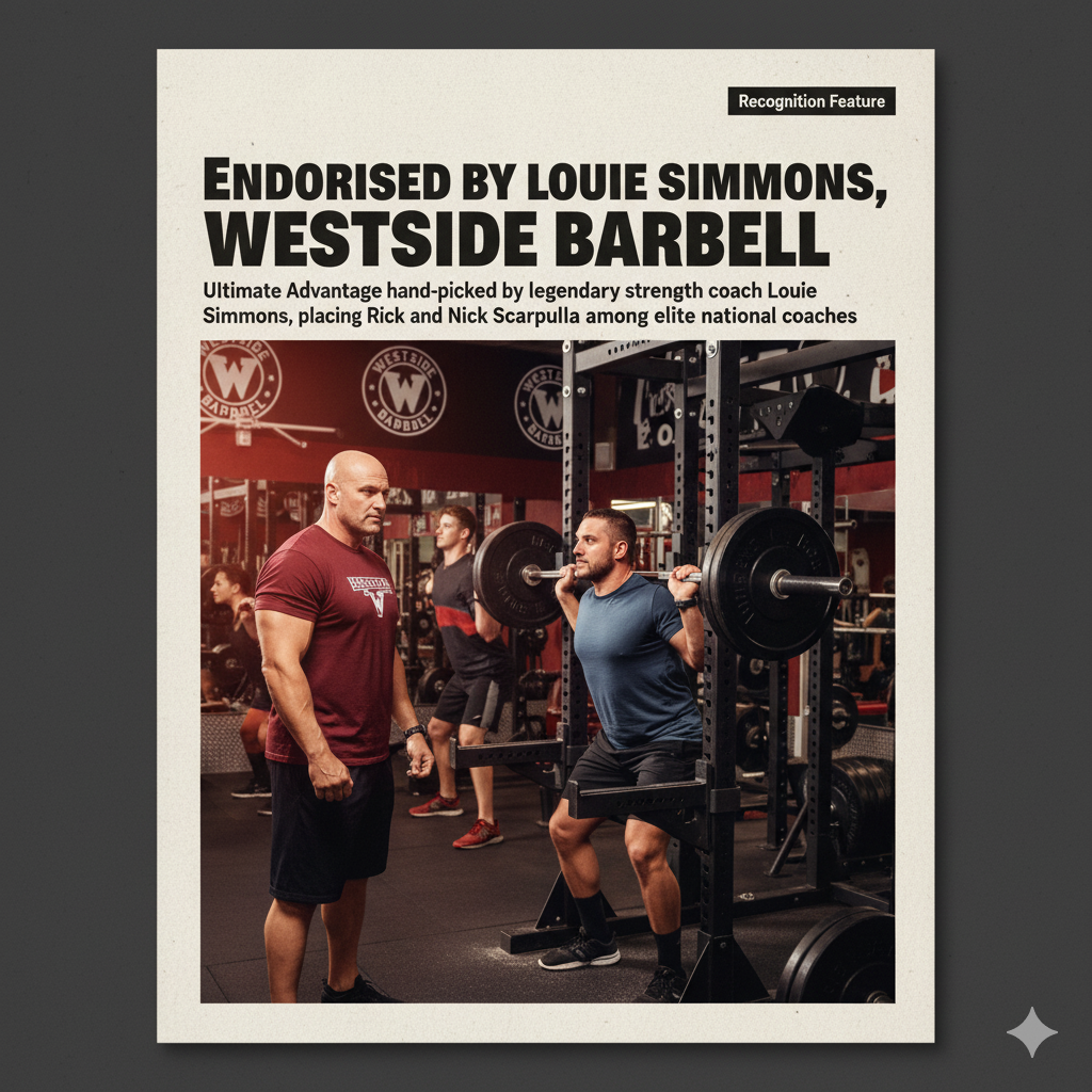 Ultimate Advantage earned the distinction of being hand-picked by legendary strength coach Louie Simmons of Westside Barbell, a world authority on powerlifting and performance training. This recognition places Rick and Nick Scarpulla among an elite group of coaches acknowledged for their technical mastery and proven athlete results.